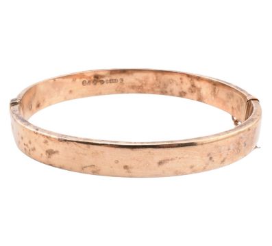 A hallmarked 9ct gold engraved hinged bangle. The 9ct yellow gold bangle having a scrolling engraved decoration to hinge and concealed box clasp. Sold as found without safety chain. Hallmarked for Chester, 1955. Maker's mark S&P. Inner diameter 6cm. All weights, measurements and sizes are approximate.