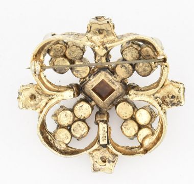 A vintage Chanel Maison Gripoix glass and simulated pearl brooch pin. The vintage brooch designed by Chanel in collaboration with Maison Gripoix having a central poured Gripoix glass cabochon set in a decorative gold tone mount set with simulated pearls and round cut yellow paste stones to hinge pin and roller clasp verso. Signed CHANEL to verso. Measures 5.5cm x 5.5cm. Weight 34.7g. All weights, measurements and sizes are approximate.