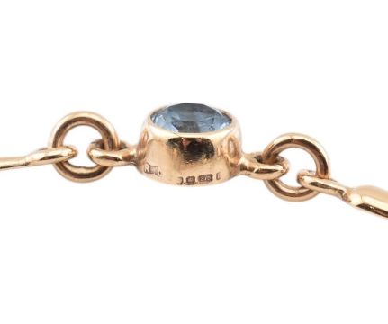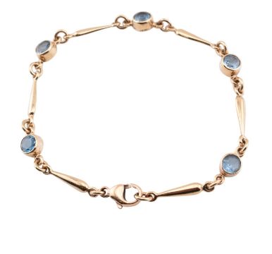 A hallmarked 9ct gold and topaz line bracelet. The 9ct yellow gold bracelet strung with five bezel set round cut blue topaz with baluster-shaped links to lobster claw clasp. Hallmarked for Sheffield, 1996. Sponsor's mark RC. Measures 18.5cm. All weights, measurements and sizes are approximate.