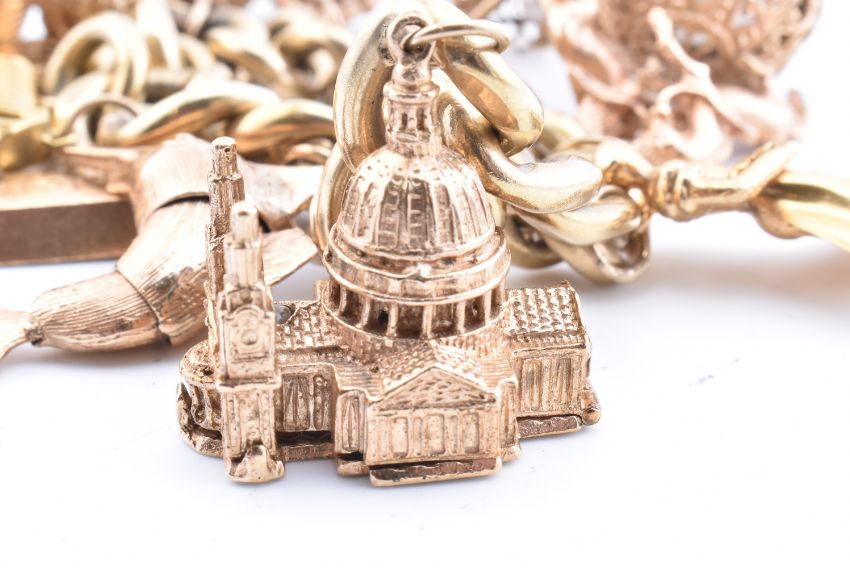 A 1970s hallmarked 9ct gold charm bracelet. The charm bracelet with large curb link chain to padlock clasp. Marks to links and padlock hallmarked London 1972. Charms to include 18ct gold Realto Bridge - Italian marks to base. 9ct gold bullion bar, hallmarked Birmingham 1976 L&W. 9ct hallmarked sword fish - marks faint. Hallmarked 9ct gold St Paul's Cathedral. A Spanish matador - unmarked tests as 18ct gold. Hallmarked 9ct gold twin horse smoky quartz fob, hallmarked 9ct gold. A pearl basket, Hallmarked 9ct gold. Aladdin's lamp - missing battery. All weights, measurements and sizes are approximate.