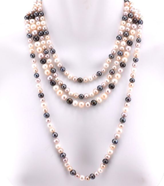 Two cultured pearl necklaces strung with silver pink, white and champagne pearls. One necklace measuring 160cm, the other having a screw clasp measuring 47cm. Pearls measure smallest 0.6cm x 0.6cm. Largest pearls measure 0.7cm x 0.7cm. All weights, measurements and sizes are approximate.