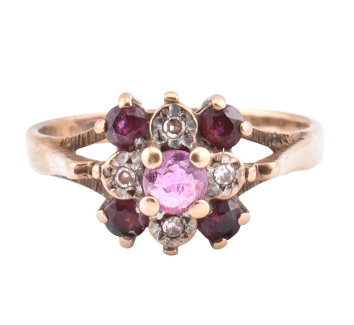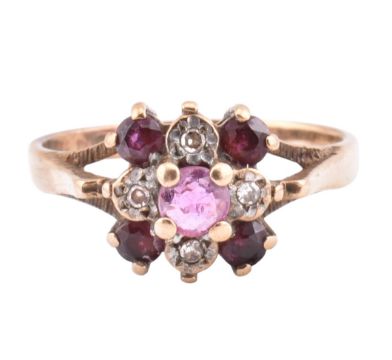A hallmarked 9ct gold and gem set cluster ring. The ring set with a central round cut ruby surrounded by a halo of four illusion set round brilliant cut diamonds and four round cut spinel to tapered shoulders. Hallmarked for Edinburgh, 1981. Stamped over hallmark. Evidence of repair/resizing to the shank. Size P. All weights, measurements and sizes are approximate.