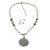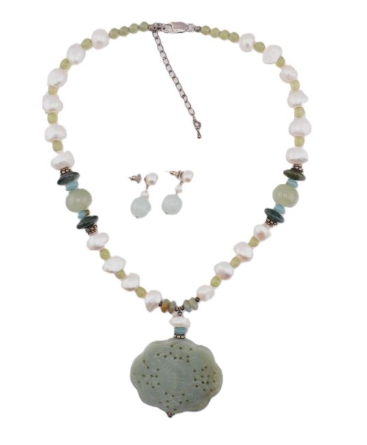 Two silver Chinese pendant necklaces and a pair of matched earrings. The necklace to include a hard stone, moss agate and pearl Chinese pendant necklace and a rutilated quartz and hardstone pendant necklace. Together with a pair of matched pearl and hardstone pendant earrings. Necklaces measures 44cm - 55.5cm. Earrings measure 3cm x 1cm. All weights, measurements and sizes are approximate.