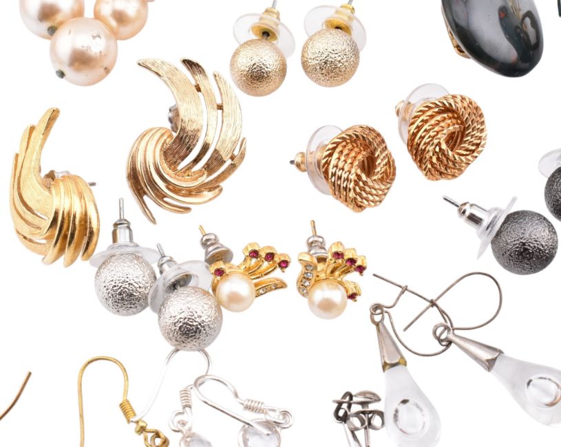 A large collection of costume earrings. The collection of earrings to include gem set pendant earrings, stud earrings, silver and blue stone rose stud earrings, tiger's eye set, thread-through pendant earrings, French hooks and more. Blue rose earrings marked 925. Largest measures 3.5cm x 2.5cm. Smallest measures 1cm x 1cm. Total weight 155g. All weights, measurements and sizes are approximate.