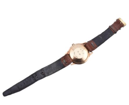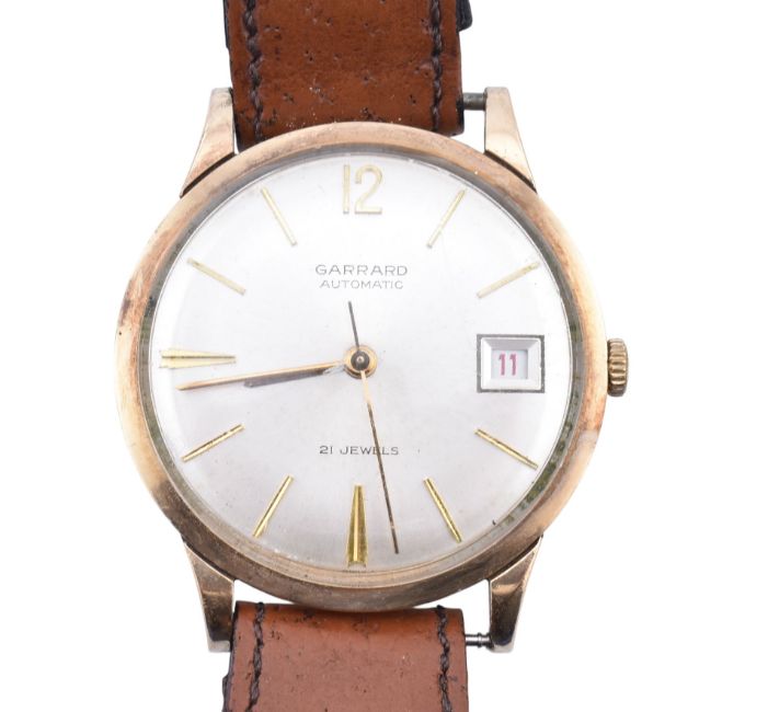 A hallmarked 9ct gold Garrard gents wristwatch. The Garrard automatic 21 Jewels wristwatch having stick indices with an Arabic number to 12 o'clock and date aperture at 3 o'clock to gold case and leather strap. The watch case verso inscribed with G.E.C, G.P 1945-1966. Case 4cm x 3.2cm (excluding crown). Measures 23.5cm. All weights, measurements and sizes are approximate. All watches are sold as untested, therefore without warranty.