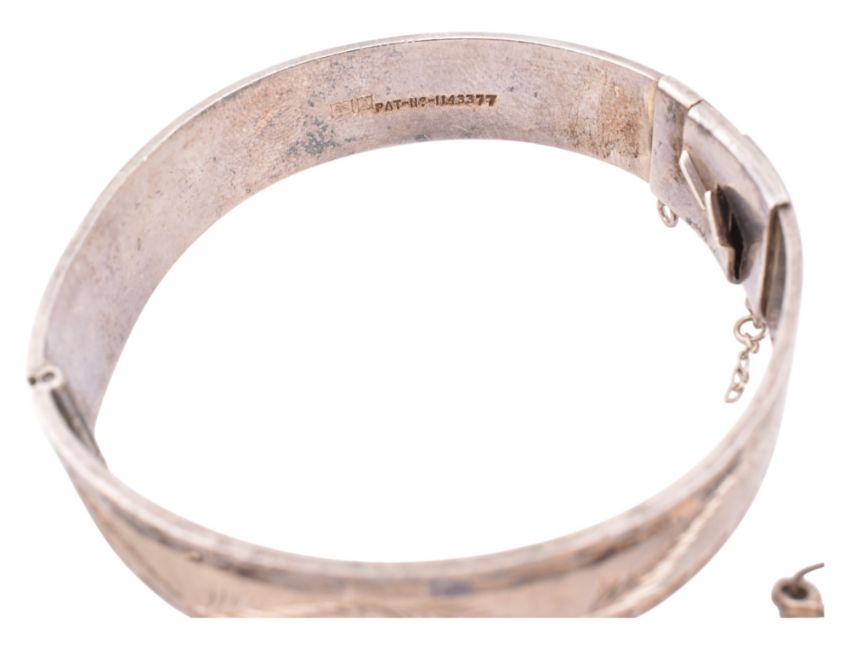 A collection of silver jewellery. The collection of silver jewellery to include a hallmarked silver engraved hinged bangle with AF safety chain, hallmarked for Birmingham, 1972 together with maker's mark R.J.Co. A silver filigree panel bracelet comprised of Maltese cross shaped links, marked 925 to spring ring clasp. A silver pierced panel bracelet, marked 925 to clasp. A silver crucifix pendant necklace, marked 925 to pendant verso and belcher link chain necklace. Hinged bangle inner diameter measures 5.5cm. Maltese cross panel bracelet measures 17.5cm. Panel bracelet measures 19cm. Crucifix necklace measures 41cm. All weights, measurements and sizes are approximate.
