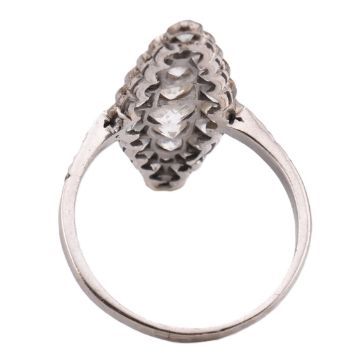 A hallmarked 18ct gold and navette diamond cluster ring. The ring having a navette shaped head set with 35 diamonds largely old cut diamonds with rose cut diamond accents set within silver with a gold under bezel and shank. The shank likely a replacement having diamond set shoulders hallmarked for 18ct gold Birmingham. Weight 3.1g. Estimated diamond weight 2.75 - 3ct. With associated Insurance valuation from Mallory of Bath. Size Q. All weights, measurements and sizes are approximate.