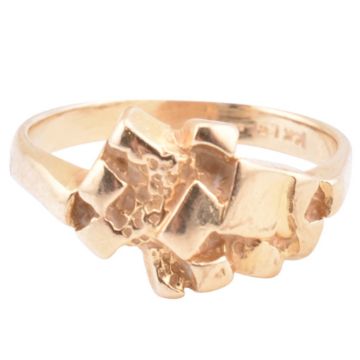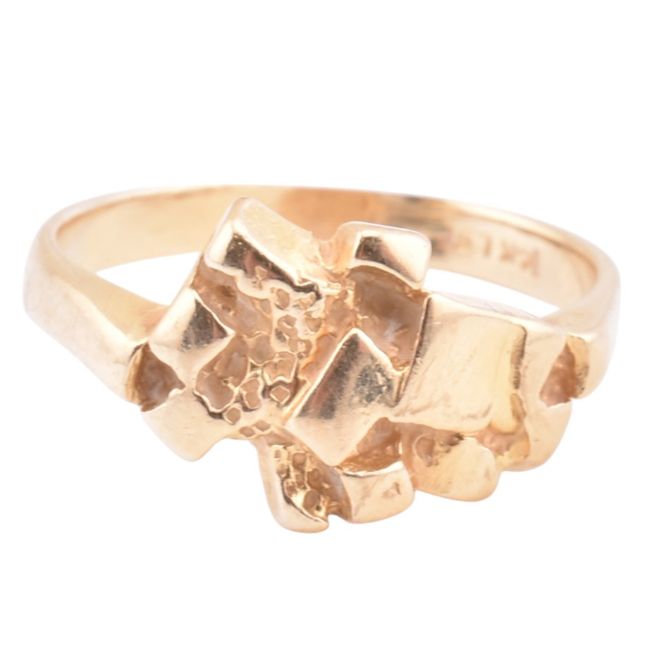 A 14ct gold dress ring. The 14ct yellow gold ring having an abstract head to polished shank. Stamped 14k to inner shank. Size M-M.5. All weights, measurements and sizes are approximate.