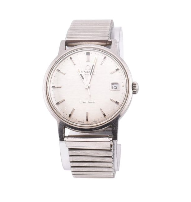 An Omega Geneve automatic wristwatch boxed. The Omega wristwatch having a round dial with stick indices with sword hands and date aperture at 3 o'clock to stretch bracelet strap. The dial signed Omega Automatic and Geneve. Measures 4cm x 3.5cm (excluding crown). Stretch bracelet expandable. The Omega watch to come in original red leatherette presentation box with international guarantee booklet. All weights, measurements and sizes are approximate. All watches are sold as untested, therefore without warranty.