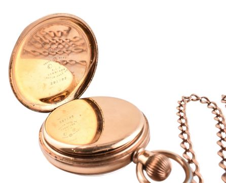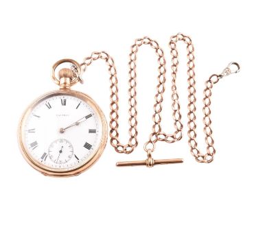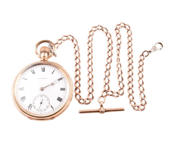 A gold plated Waltham pocket watch on a hallmarked 9ct gold watch chain. The gold plated Waltham open face pocket watch having Roman numeral indices, spade hands and subsidiary seconds dial to gold plated case. The pocket watch marked 'MOON' and A.L.D Dennison Watch Case Co 291792 to inner case. The watch having survived World War I. The lot to also include a 9ct gold curb link watch chain with hallmarked 9ct gold T-bar and metal dog-lead clasps. T-bar partially hallmarked with 9ct gold standard mark together with maker's mark E.W. Pocket watch measures 7cm x 5cm. Watch chain measures 48.5cm. All watches are sold as untested, therefore without warranty. All weights, measurements and sizes are approximate.