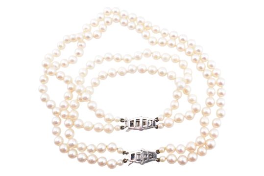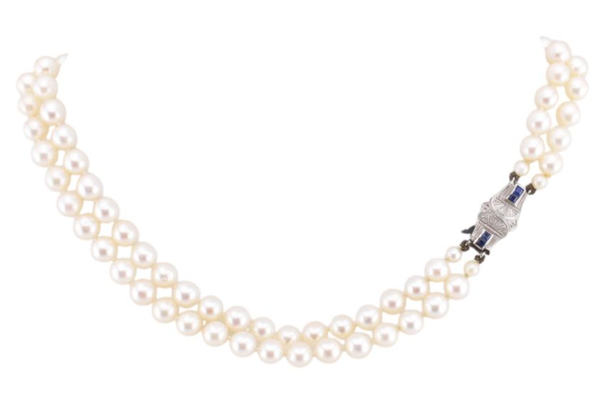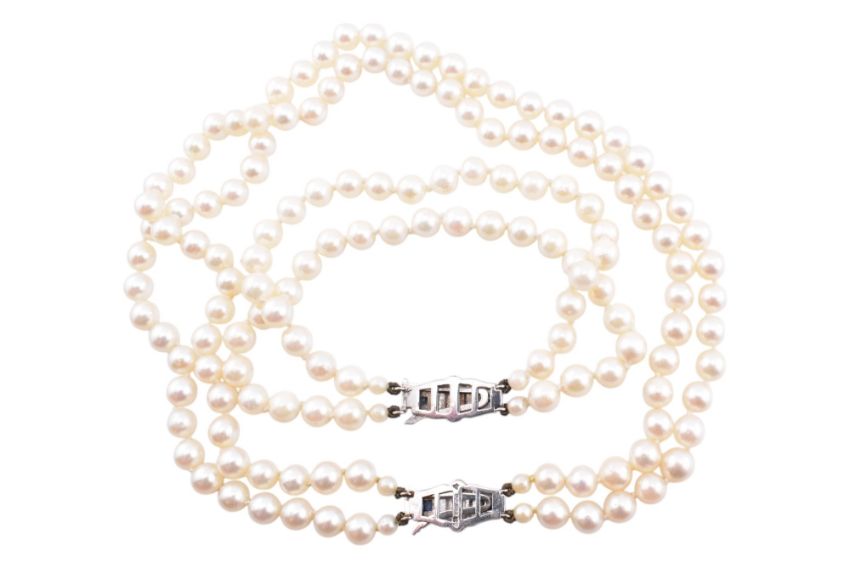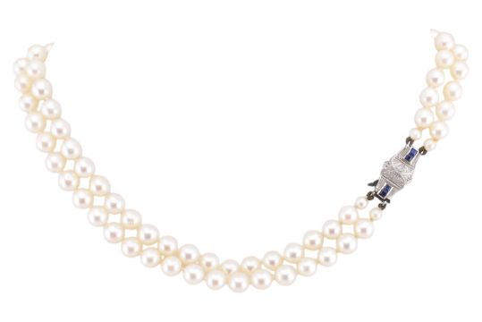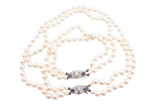 A hallmarked 9ct white gold, sapphire and pearl necklace and bracelet suite. The necklace and bracelet both strung with two strands of cultured pearls, measuring 5mm-6mm, to a hallmarked 9ct white gold Art Deco style pearl clasp set with four princess cut sapphires. Hallmarked Birmingham, 1986 together with sponsor's mark JR. Bracelet clasp unmarked however surface tests indicate 9ct gold. Necklace measures 32cm. Bracelet measures 20cm. Total weight 56.8g. All weights, measurements and sizes are approximate.