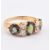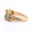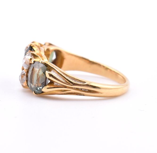 A gold and green stone and diamond three stone ring. The ring set with a central oval cut green stone, flanked by two round cut green stones, possibly alexandrite, having four old cut diamond accents stones. Marks illegible. Assessed as 18ct gold. Total weight 5.4g. Size N.5. All weights, measurements and sizes are approximate.