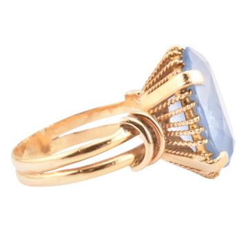 An 18ct gold and synthetic spinel ring. The 18ct yellow gold ring having a single four claw set oval cut synthetic spinel set within a rope twist decoration basket mount to bifurcated shoulders. Mark to inner shank rubbed, surface tests indicate 18ct gold. Size N. All weights, measurements and sizes are approximate.