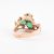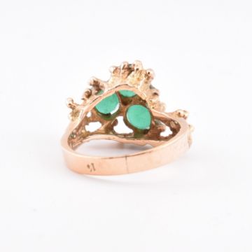 A 14ct gold and green chrysoprase three stone ring. The 14ct gold ring having three mixed cut green chrysoprase set within a decorative mount to bark effect shoulders and polished shank. Stamped 14 for 14ct gold. Size N.5. All weights, measurements and sizes are approximate.