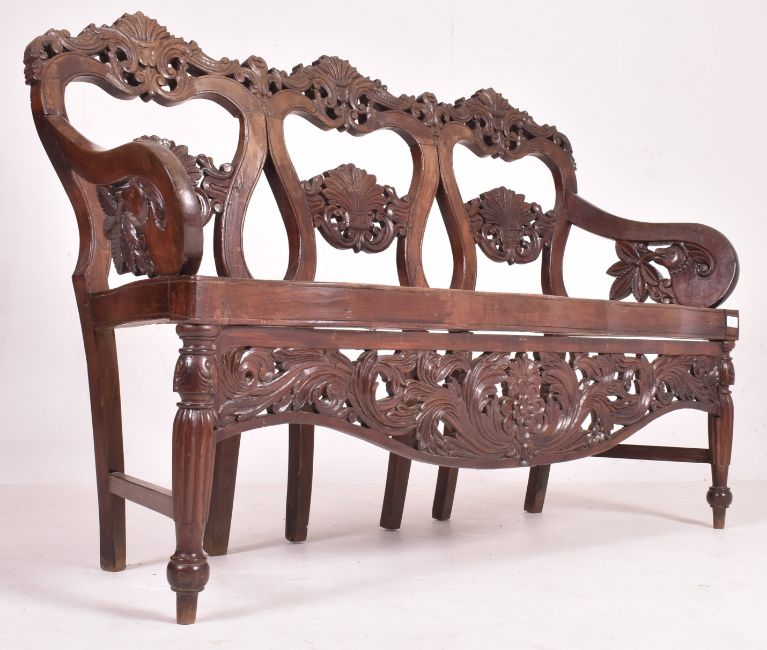 An Indo - Portuguese manner hardwood and cane hall bench. The bench having a carved pierced back rest with scrolled foliate motifs and matching back splats. Arm rests to each end terminating in S scroll & finishing with fish motif. Cane worked woven seat panels over scrolled & floral apron. All raised on turned legs.