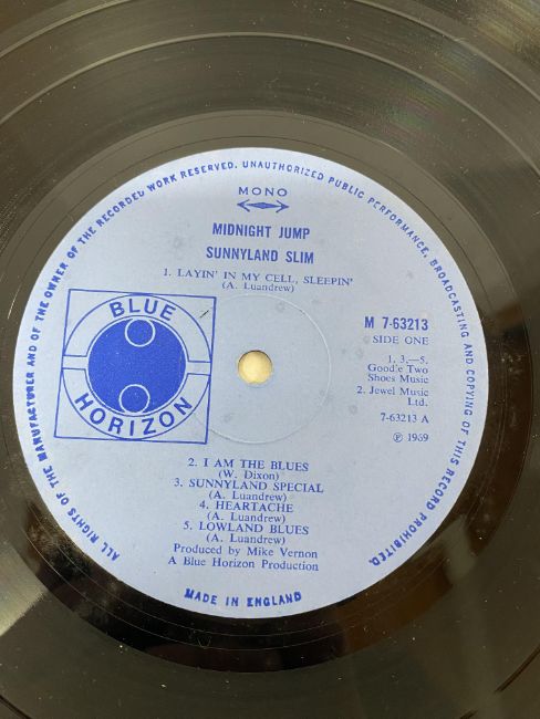 Sunnyland Slim - Midnight Jump - a long play / LP vinyl record album on the Blue Horizon label (M 7-63213). With laminated sleeve. Matrix numbers endings A1 / B2. Record condition VG.
