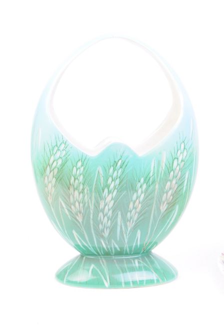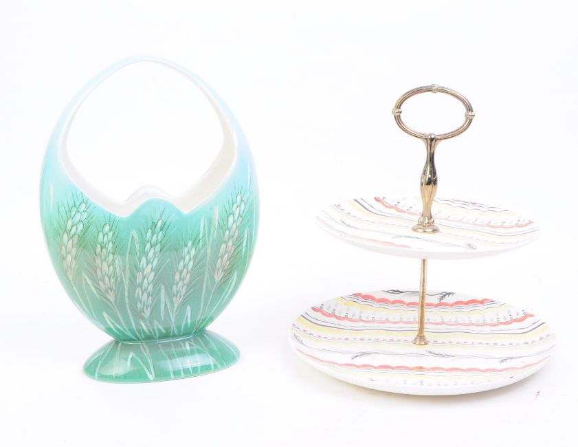 A 1950s Royal Winton grimwade chintz pattern two tier cake plate with a Beswick porcelain blue glaze basket vase decorated with a wheat themed design. Makers marks to the underside of each piece. Largest measuring approx. 24cm x 25cm.