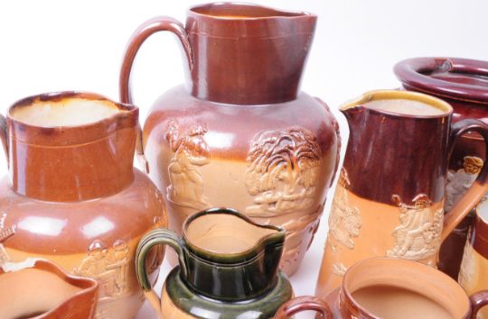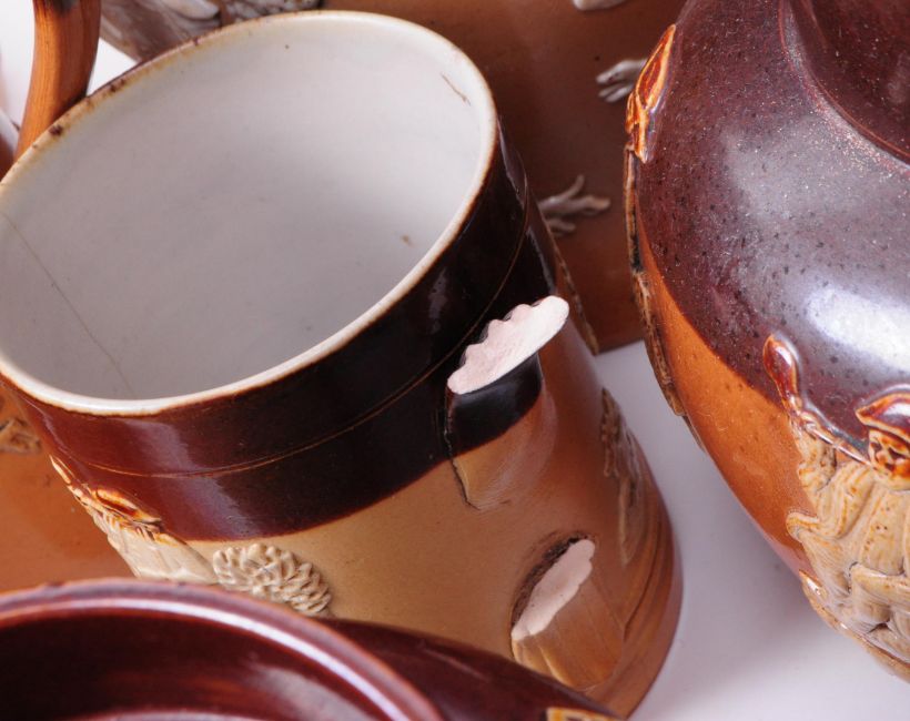 Large collection of 20th century Royal Doulton Lambeth stoneware, comprised of lidded pots, jugs, teapots, vases and more. Varying makers marks printed to the underside of each piece. In brown and cream colourway with white decorative relief figures. Some pieces AF.