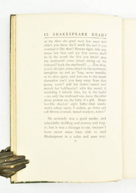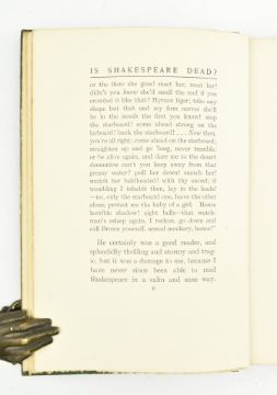 Twain, Mark (pseud. Samuel Langhorne Clemens). 1909 Is Shakespeare Dead? from my Autobiography. New York & London: Harper & Brothers Publishers. First edition, UK export state, stamped to limitations page Printed in U.S. of America. Publisher's green cloth, gilt lettering to spine & front board, some bumping to extremities and to head and tail of the spine, minor wear to front board, pencil inscriptions to ffep, internally bright. 8vo. (1)