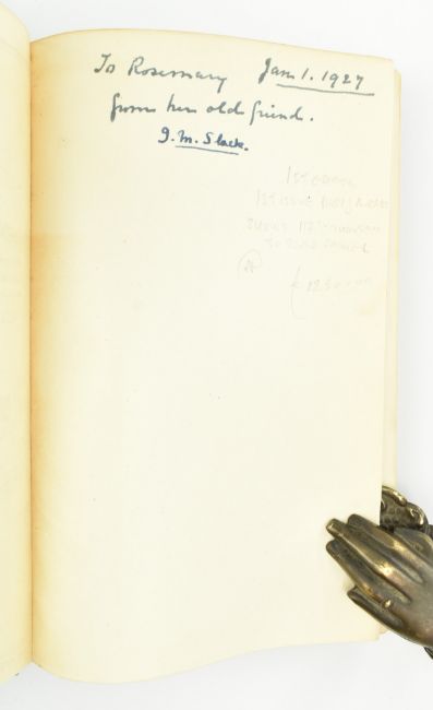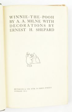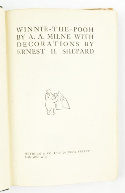Milne, A. A. 1927 Winnie the Pooh by A. A. Milne with Decorations by Ernest H. Shepard. Methuen & Co. Ltd., first edition, first impression in the original first issue dust jacket. Publisher's green cloth with gilt pictorial figures of Pooh & Christopher Robin to front board, extremities lightly bumped as are the head & tail of the spine; in unclipped first issue dust jacket stating 117th Thousand to rear flap advertising When We Were Very Young, jacket in need of sympathetic restoration with significant loss to front & tail of the spine (price intact), illustrations on the cover of the flap hand coloured in watercolour, spine sunned with loss to the head affecting the title, extremities also with some minor losses. Contemp. gift inscription to Rosemary from Isolina M. Slack to front blank, also with letter from the same stating that should Rosemary already have the title she shall send her a copy of Dr. Doolittle instead. A first edition, first impression of Milne's masterpiece of children's literature, complete with dust wrapper. 8vo. (1)