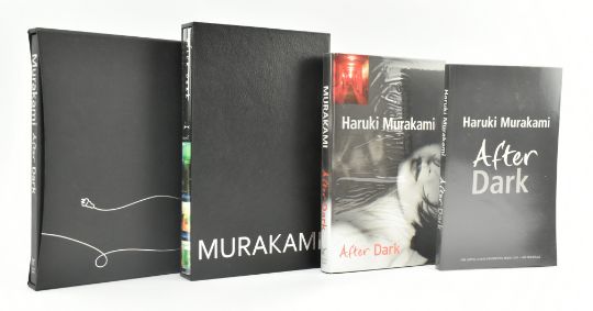 Murakami, Haruki. 2007 After Dark, trans. Jay Rubin. Four editions, comprising Harvill Secker uncorrected proof copy, Harvill Secker first edition with complete number line in unclipped dust wrapper, Borders limited edition of 800 with silver embossed pictorial TV to boards & housed in matched slipcase, and a signed first US edition publ. Alfred A. Knopf, signed Haruki & stamped to front blank, publisher's boards with unclipped dust wrapper, Strand Signed Copy label to cover, housed in custom slipcase. An excellent collection. 8vo. (4)