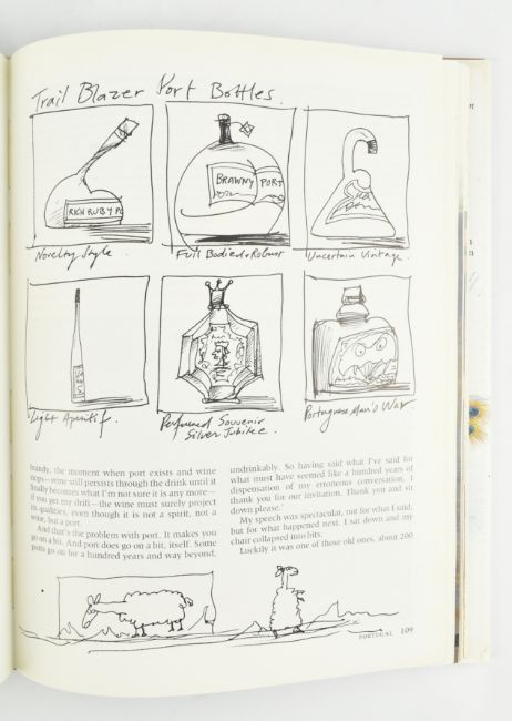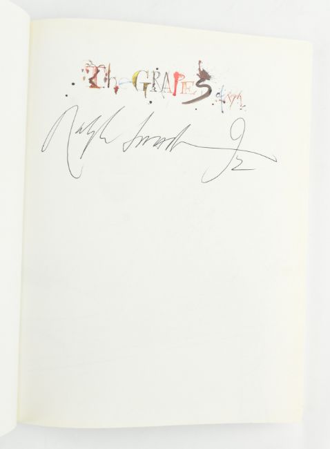 Steadman, Ralph. 1992 The Grapes of Ralph - Wine According to Ralph Steadman. Signed first edition, first impression. London: Ebury Press. Publisher's orig. cloth in clipped dust wrapper; some damp staining to tail of the spine, extremities discoloured & worn, occ. stain to spine of dust wrapper, covers discoloured, open tear of approx. 1cm to head of spine; signed by author & dated 92 to half title, internally clean. 4to. (1)