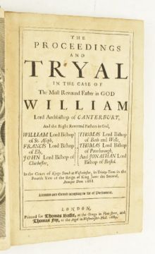 British history, trials:- James II and the Glorious Revolution. 1689 The Proceedings and Tryal in the case of the Most Reverend Father in God William Lord Archibishop of Canterbury...In the Court of King's Bench at Westminster, in Trinity Term in the Fourth Year of the Reign of King James the Second, 1688. Printed for Thomas Basset, 1689. Bound with 1689 A Discourse concerning the Illegality of the late Ecclesiastical Commission - written by Edward Stillingfleet, printed for Henry Mortlock; and 1680 That The Bishops in England May and Ought to Vote in Cases in Blood. Written in the Late Times upon occasion of the Earl of Straffords Cafe. By a Learned Pen [Thomas Barlow]. Printed for Walter Davis. Trial of Seven Bishops complete with engraved frontispiece (having been laid down, as has title page). Later half calf & paper covered boards, extremities bumped and worn with some loss, paper a little tired, joints starting, later inscriptions to 19th c. endpaper. Three works bound as one, two of the tracts being extremely uncommon. Folio. (1)