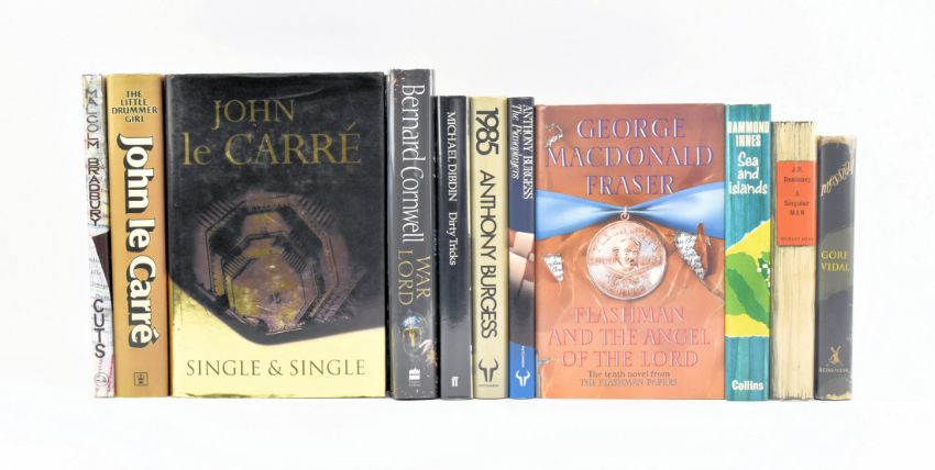Modern first editions. A collection of eleven titles. Comprising 1986 The Pianoplayers & 1978 '1985' by Anthony Burgess, 2020 War Lord by Bernard Cornwell, 1955 Messiah by Gore Vidal, 1964 A Singular Man by J. P. Donleavy, 1999 Single & Single by John Le Carre & 1983 The Little Drummer Girl by the same, 1967 Sea and Islands by Hammond Innes, 1987 Cuts by Malcolm Bradbury, 1994 Flashman and the Angel of the Lord by George MacDonald Fraser, 1991 Dirty Tricks by Michael Dibdin. All in publisher's cloth with smart dust wrappers. 8vo. (11)