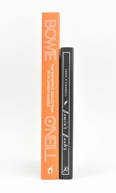 Photographic interest:- O'Neill, Terry. 2016 Bowie - The Definitive Collection of Unseen Images. Containing O'Neills photogaphs of David Bowie across his career. Publisher's photographic boards, orange cloth spine, signed by O'Neill to bookplate, minor bumping to extremities & to the head of the spine; together with 2019 Bowie's Books - The Hundred LIterary Heroes who Changed His Life by John O'Connell, signed exclusive first edition, signed to title & blind stamped, no. 80 of 100, orig. black boards with minor wear to the head and tail of the spine. Two lovely collector's book on David Bowie. Largest 4to. (2)
