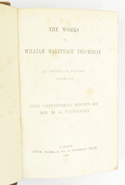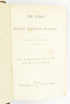 Bindings. 1883 The Works of William Makepeace Thackeray in Twenty-Six volumes. London: Smith Elder & Co. Contemp. half leather, gilt spines, morocco spine labels, noticeable rubbing, extremities bumped, marbled boards, edges & endpapers. Eighteen volumes of the original twenty-six, lacking vols I, II, VII, VIII, XXI & XXIV. 8vo. (18vol)