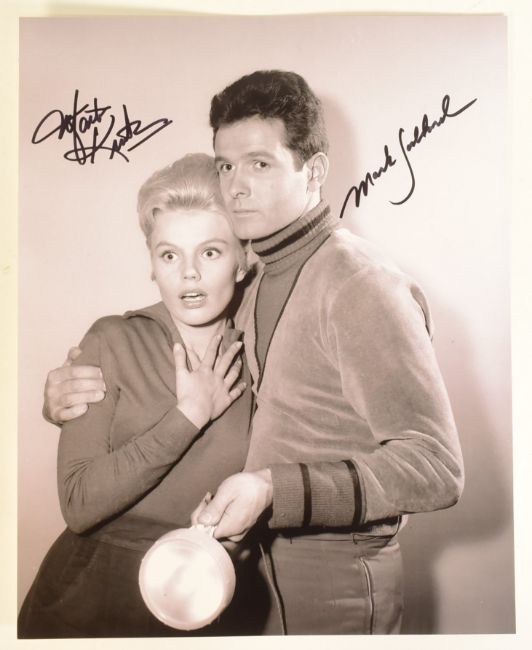 Lost In Space (1965 American TV Series) - double autographed b/w cast photograph signed by Mark Goddard and Marta Kristen. Each signed in black ink to a light area of the image, undedicated. Supplied with a certificate of authenticity from an AFTAL Approved Dealer.