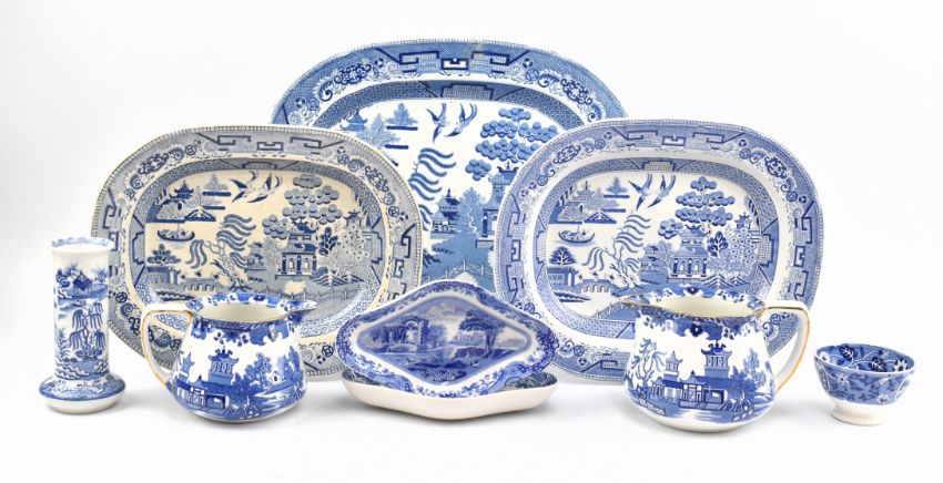 A collection of early 20th century & later English Willow pattern blue & white ceramic pieces. The lot to include various sizes serving platters, Burleigh ware Willow jugs, Mason's Ironstone spill vase, Spode Italian blue and white pickle dishes, & more.