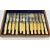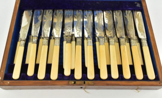 A set of 20th century silver plated cutlery fish serving set made by Arnold & Lewis, Late Simmons, 7 St Anns Square, Manchester. Presented in a wood case. The set to include fish servers, twelve knifes and twelve forks. Each knife decorated with leaf vignette and carved details with bone handle. The wooden case having a brass crest inlay on top.