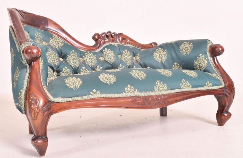 An early 20th century apprentice piece mahogany upholstered chaise longue settee daybed. The settee featuring scrolling mahogany frame carved with floral detailing, featuring green buttonback upholstery.