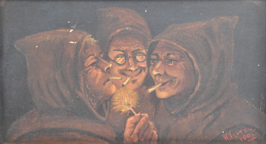 W. Veitch - an early 20th century oil on board satirical painting. The painting depicting three hooded monks smoking. Signed lower right. Framed.