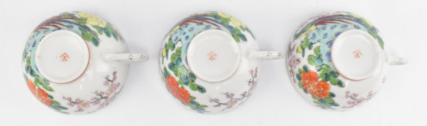 A collection of six mid century Japanese Suzuki porcelain coffee / teacups & saucers. The lot to include three coffee cups, a saucer and two plates depicting birds and flowers. Marked to the base.