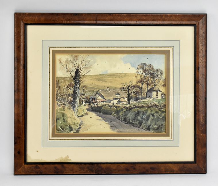 Claude Muncaster (British, 1903-1974) - ' Boscombe in Dorset ' - An early 20th century watercolour on paper landscape painting with country road and cottage. Signed lower left. Mounted, framed & glazed. The Fine Art Society, London label to back.
