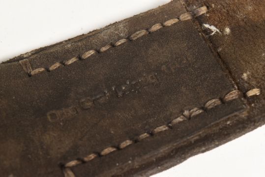 A WWII Second World War Third Reich Nazi German Hitler Youth belt and buckle. The buckle stamped RZM 4/23 and the leather belt dated 1938. Measures approx 110cm.