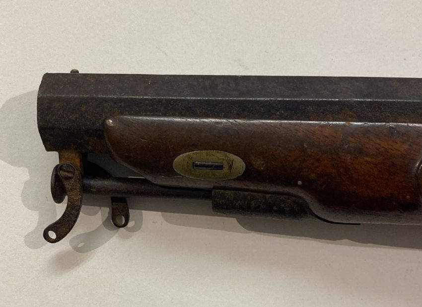 An early 19th Century Victorian Percussion hammer action pistol with chequered walnut stock, trigger guard and pineapple motif, lockplate with percussion cap mechanism, octagonal barrel and captive ram rod.