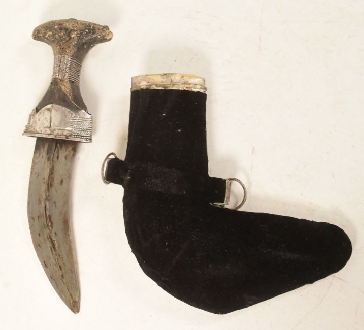 An early 20th Century Arabian / Omani Khanjar / Jambiya dagger. The curved blade with a pronounced central rib housed in an intricately decorated white metal scabbard with filigree decoration, woven silver rings and a velvet back piece. Measures approx 30cm.