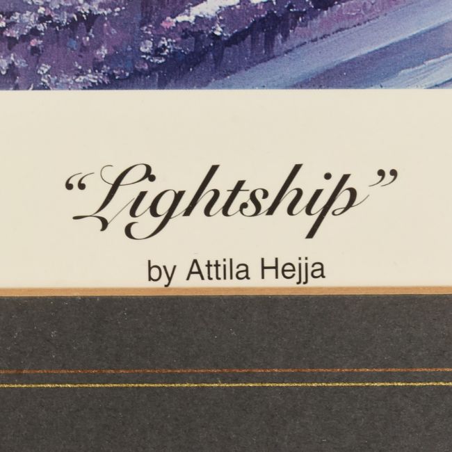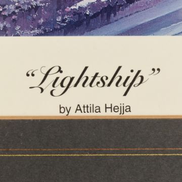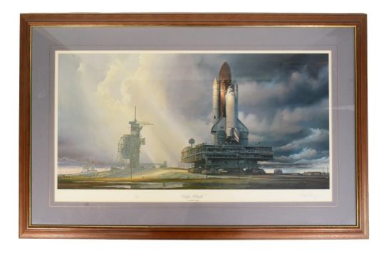 After Attila Hejja (1955-2007) - x2 signed prints by NASA artist Attila Hejja comprising "Cape Winds" depicting the Space Shuttle on the Launch Pad and "Lightship" depicting the Space Shuttle during a night launch. Each signed in the lower right corner. Largest measures approx 80x90cm.