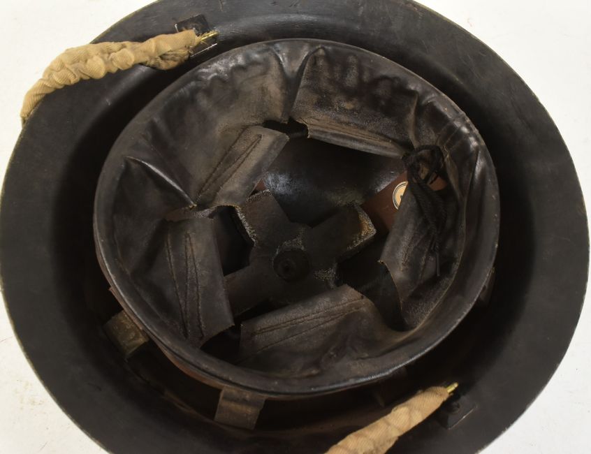 A WWII Second World War British Home Front Plasfort Fibre Lightweight helmet with white notation applied to the front for a Barclays Bank Manager. Made by Dunn & Co with label on the inside. Retaining canvas chin strap.