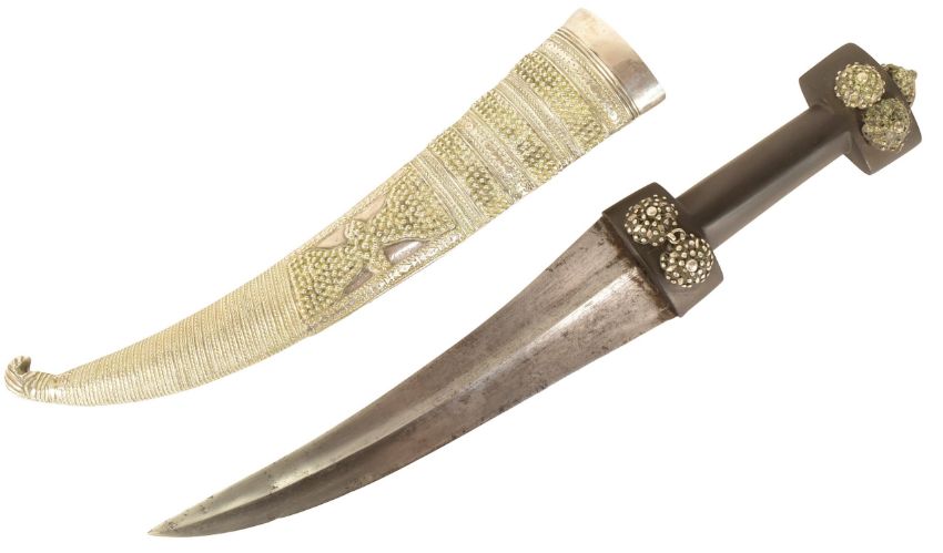 An early 20th Century Iraq / Kurdish Marsh Arab 900+ silver jambiya dagger having a bone hilt with silver beaded mounts, blade with a pronounced central rib and a polished silver scabbard decorated with granulation and fine wire banding. Measures approx 43cm.