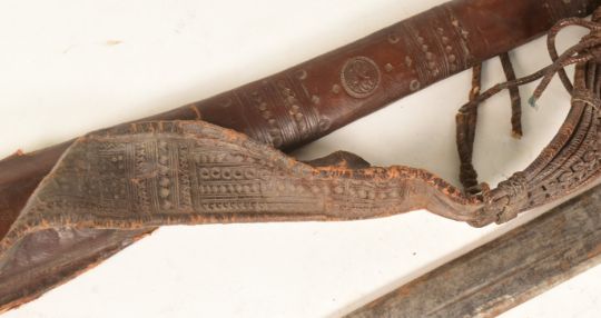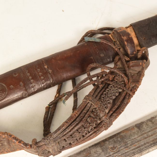 An early 20th Century North African ( Sudanese ) Mahdi Kaskara sword. Wooden grip wrapped with thin leather bands, cruciform hilt and a double edge blade with 3 fullers and crescent moon shaped motifs. Housed in a leather scabbard, AF. Measures approx 95cm.