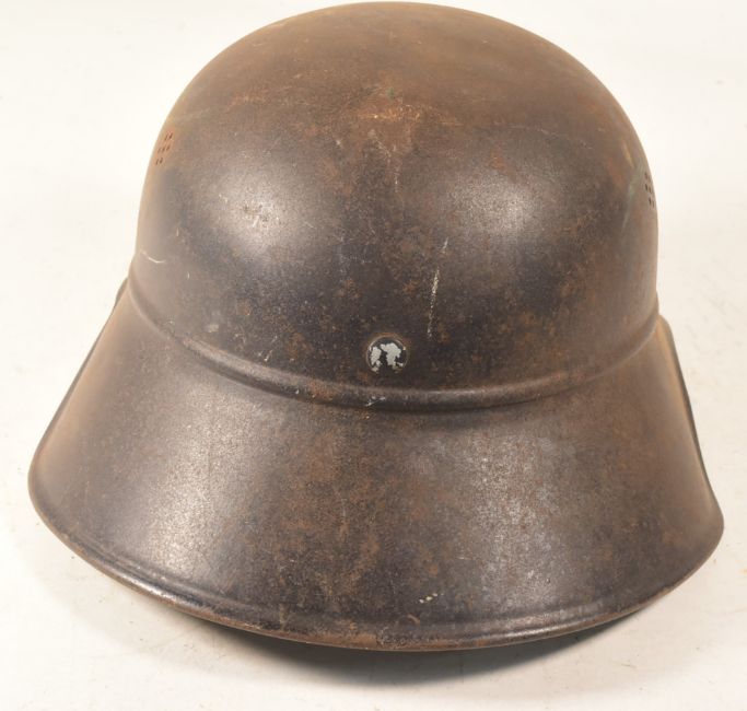A WWII Second World War Third Reich Nazi German Luftschutz / Air Defence gladiator pattern helmet with pierced ventilation holes and winged LUFTSCUTZ swastika to the front. Retaining part of the leather liner and stamped along the rim RL2 39/21.