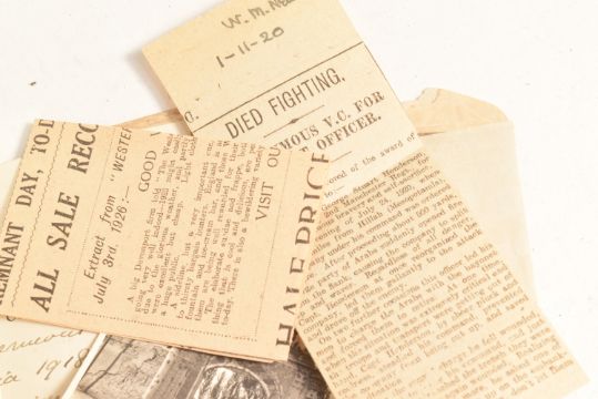 First World War military interest. 1920 The Adventures of Dunsterforce by Major-General L. C. Dunsterville. London: Edward Arnold. Author's presentation copy to his comrade Captain M. S. Aldham (later Major) with original photographs from their exploits tipped in and loosely inserted, along with a letter 'To Captain Michael S. Aldham, in memory of strenuous days in North West Persia 1918, yours very sincerely Lionel Dunsterville'. Publisher's red cloth, a touch shaken & bumped with extremities discoloured & spine faded; pencil ownership inscription of Major M. S. Aldham - Shelton & Co. Lostwithiel to ffep, bookplate of Foster Yeoman Ltd. verso, front hinge visibly strained & exposed after ffep. Illustrated with black and white photographic plates throughout, also with tipped in original photographs of the mission including of double turreted armoured cars, Baghdad, a Kurd camp, Khanikin, a Kurd road guard near Harunabad, Kermanshah, Bisirun Bridge, Persian waggons used by Russians, Manjil, as well as a photograph of South African soldier Pennington & a humorous anecdote to accompany about having his knees kissed (p.188). Over 30 original photographs tipped in. An important military account of the Allied Dunsterforce and the Battle of Baku, illustrated with original photographs taken by a force soldier & dedicated from Dunsterville himself. 8vo.