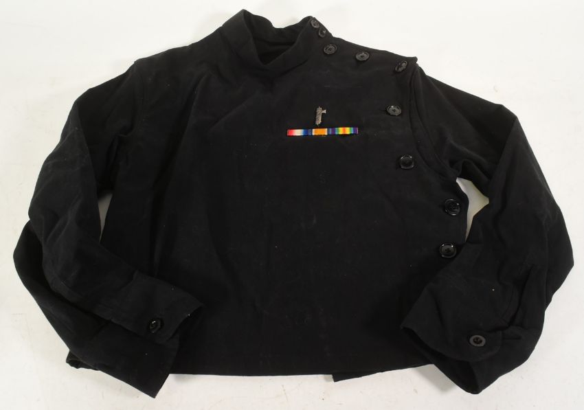 A circa 1930s British Union of Fascists Black Shirts tunic with Spencer of London made badge and a WWI First World War medal bar. The fencing style jacket with a high polo neck fastened from the neck down the left side with buttons together with a peaked cap.