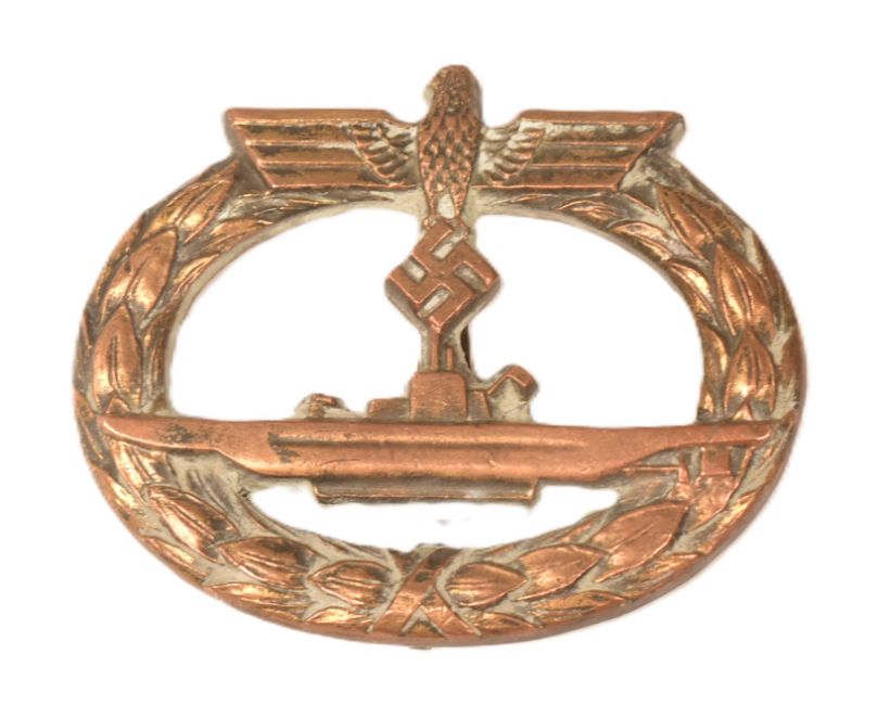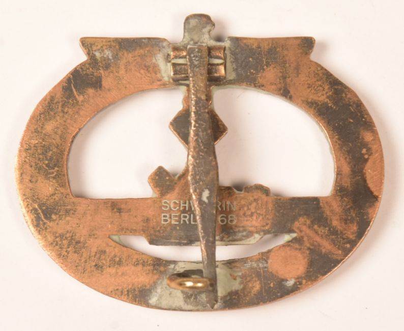 A WWII Second World War Third Reich Nazi German U-Boat crew badge together with a lapel pin. The badge depicting the profile of a U-Boat submarine within a laurel wreath. Makers mark for Schwein, Berlin.