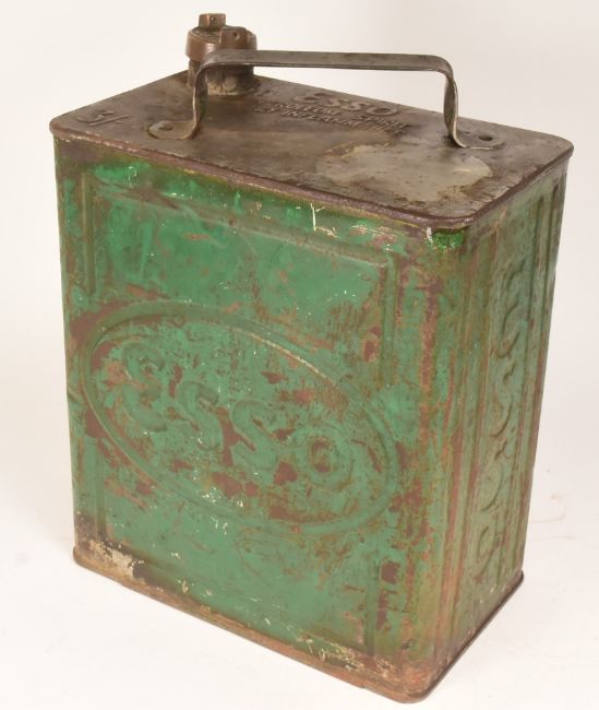 A WWII Second World War original 1938 dated Esso petrol can retaining original green paint, embossed cap and 3 shilling price. Dated on the base, 8 38. Measures approx 33x24x14cm.