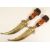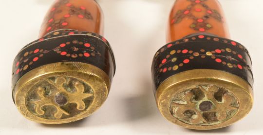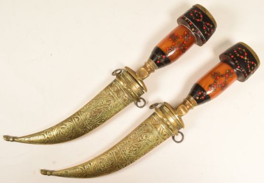 A pair of mid 20th Century Syrian Jambiya / Khanjar daggers with brass floral motif pommels, layered man made grips inlaid with coloured spots and curved blades stamped with x3 stars. Housed in carved brass scabbards. Each measuring approx 30cm.